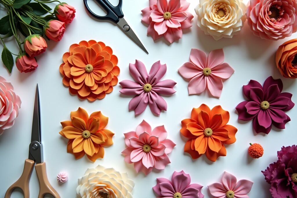 | 3D-Blumen | Blumen mit Volumen durch Raffung, Falten oder Lagen. | Fortgeschrittene, detailreiche Projekte | Mittel bis Schwer | Kleider, Kränze, Dekorationen |